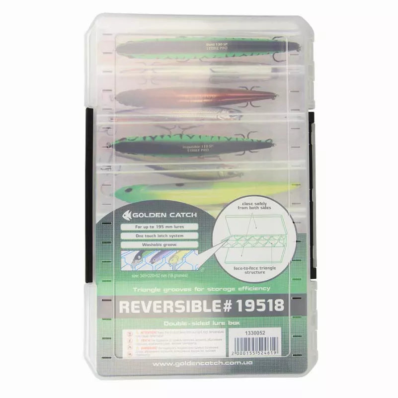 Golden Catch Reversible Box 19518(2) е двустранна риболовна кутия, предназначена за съхранение на големи воблери и други твърди примамки. Със своите 18 индивидуални отделения и V-образен профил, тя осигурява надеждност и удобство при организиране на риболовните принадлежности.