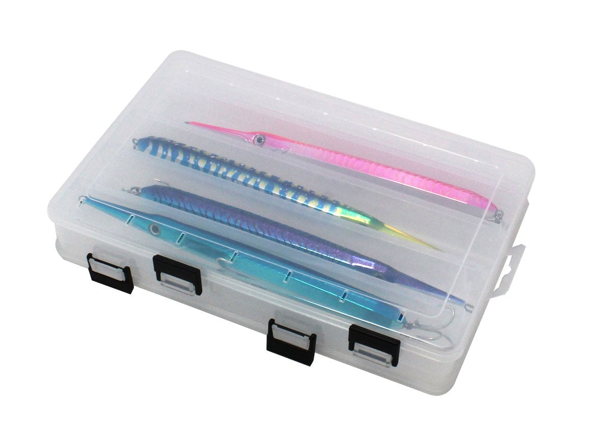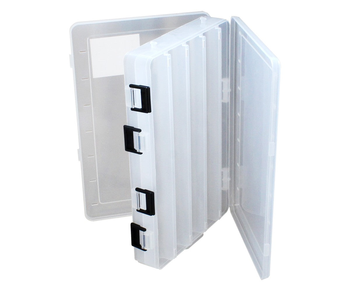 Двустранна прозрачна кутия с фиксирани Y‑образни прегради, предназначена за съхранение на по‑дълги воблери и примамки — здрава конструкция и сигурно закопчаване.